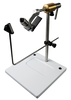 When traveling, loosening a single set screw allows the vise to be removed, and the base is designed to pack flat. The rotation resistance adjustment screw provides infinite adjustment and is easily manipulated by right or left-handed tiers. A height and length adjustable bobbin cradle are supplied with the vise